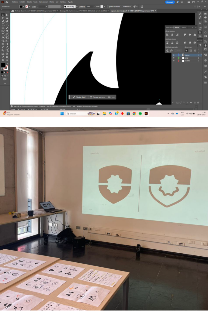 A process of formalizing the proposals begins, where the defined ideas are transferred to Illustrator to establish consistent structures, tracing systems, and graphic criteria.